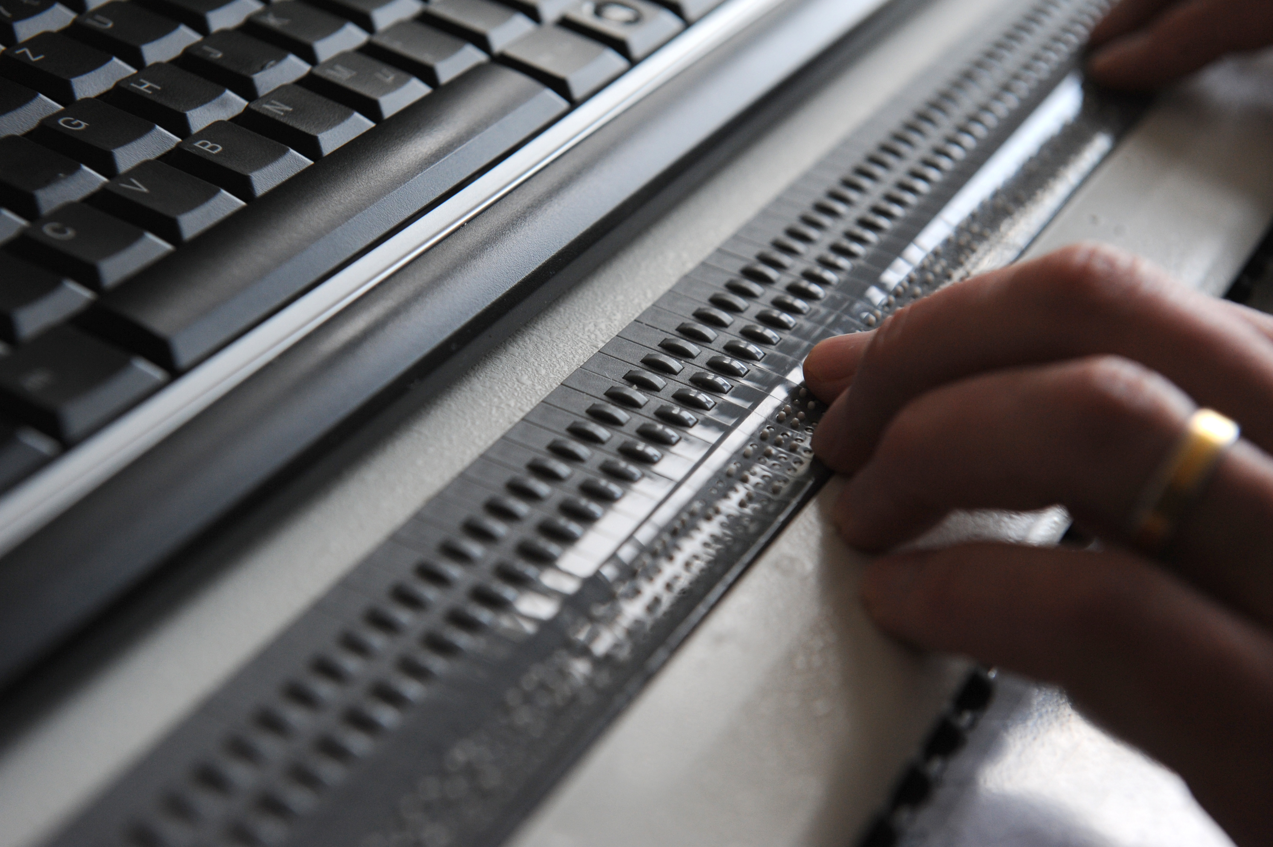 Eine zusätzliche Tastatur, die Braillezeile, ermöglicht blinden Menschen Computertexte mit den Fingern zu lesen.
